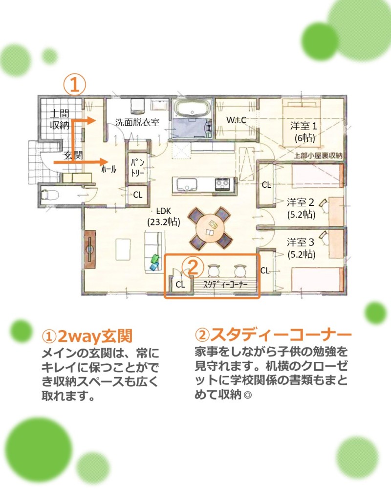 今回の間取りは、キッチンから見えるスタディーコーナーがポイント!