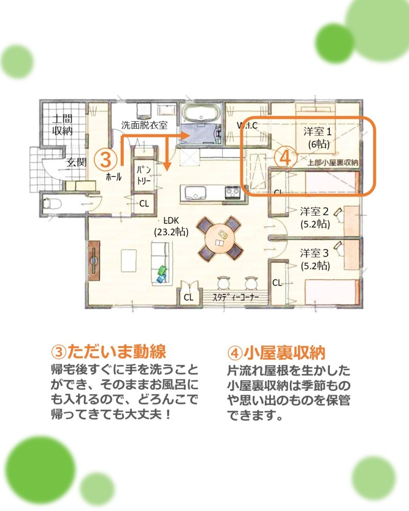 帰ってすぐに手を洗える洗面室やLDKのスタディーコーナーは