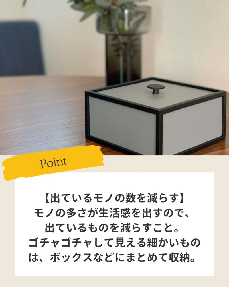 モノの多さが生活感を出すので、出ているものを減らすこと。